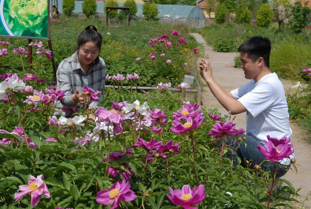 5月8日,游客在在山东省青岛市即墨区北安街道周集村芍药种植基地拍照观赏花卉
