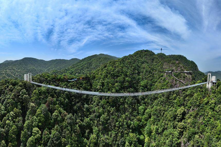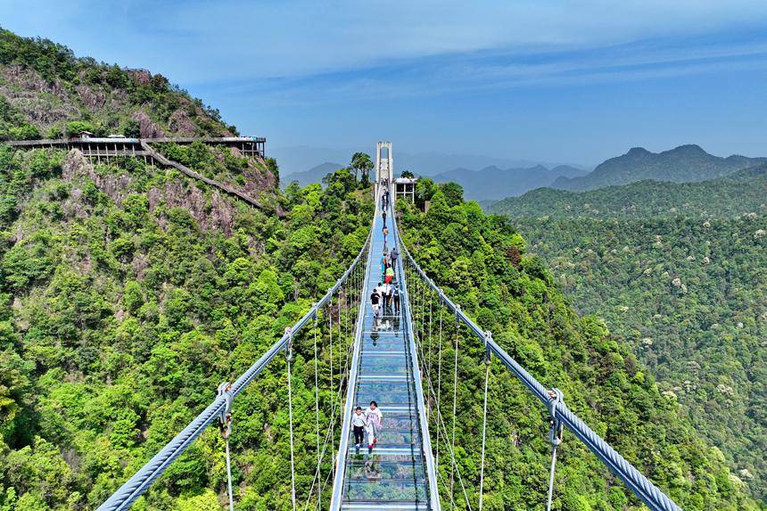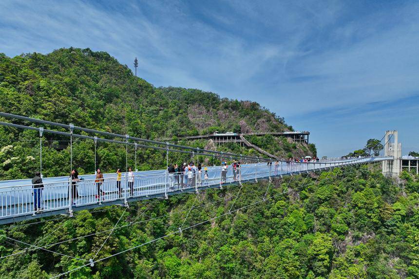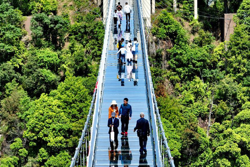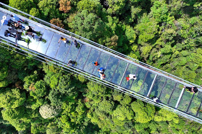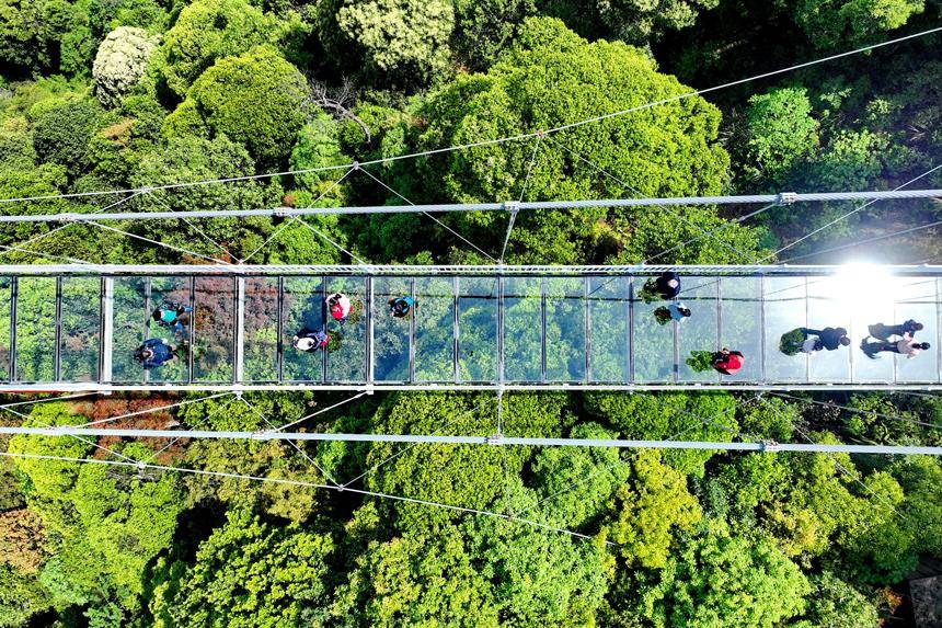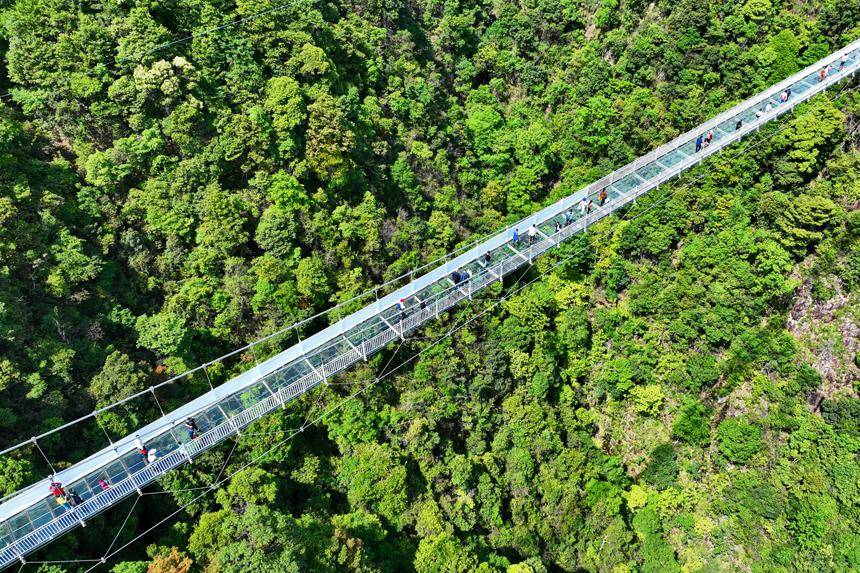江西省赣州市三百山森林覆盖率达98%,山脉连绵起伏,绿意盎然。近年来,当地通过生态修复、治理和保护,全面推行林长制,守护绿水青山,实现森林面积、蓄积量“双增长”,森林资源逐步转换成旅游资源,吸引了许多来自粤港澳大湾区的游客纷至沓来,带动乡村振兴发展。图为游客行走在玻璃桥上观赏漫山绿色生态美景。朱海鹏摄