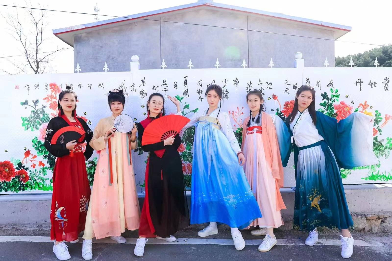 游客身穿汉服在董家沟村赏花、打卡拍照。受访者供图