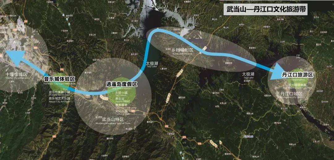 武当山—丹江口文化旅游带全长75公里,规划面积30平方公里,整合了武当山太极湖旅游度假区的核心资源、丹江口和太极五大系列文旅项目集群。重点建设逍遥岛度假区、丹江口旅游区和音乐城体验区三大片区。项目计划总投资500亿元,其中一期投资300亿元,建设周期5年。