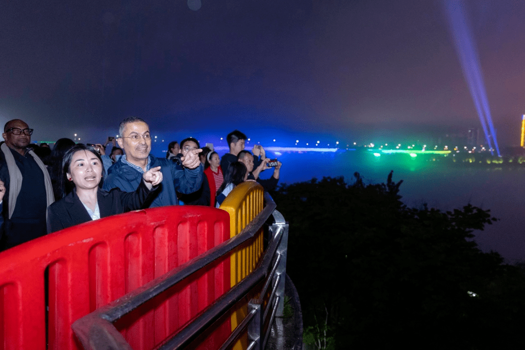5月3日,哈列德主席一行马不停蹄地奔赴十堰丹江口市,在丹江口市委常委、市委组织部部长刘庆海等领导的陪同下,在千岛画廊、碧水连天、沧浪之光、旅游港等景区,都留下了哈列德主席探访的足印,夜幕降临时分,和太极集团投资运营的世界级大型舞台秀《太极图》、如梦似幻的“夜游汉江”灯光秀、“水都花月夜”均州不夜城流光溢彩、美轮美奂,引得哈列德主席赞不绝口。