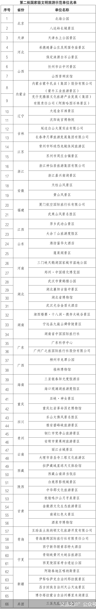 北京商报讯(记者 关子辰 实习记者 牛清妍)5月8日,据“文旅之声”公众号消息,根据《文化和旅游部办公厅关于开展〈文明旅游示范单位要求与评价〉(LB/T 075-2019)实施工作的通知》,全国旅游标准化技术委员会认定,北京市北海公园、北京市八达岭长城景区等66家单位为第二批国家级文明旅游示范单位(包括2021年因疫情原因未开展实地评定的9家单位和2022年申报的57家单位)。