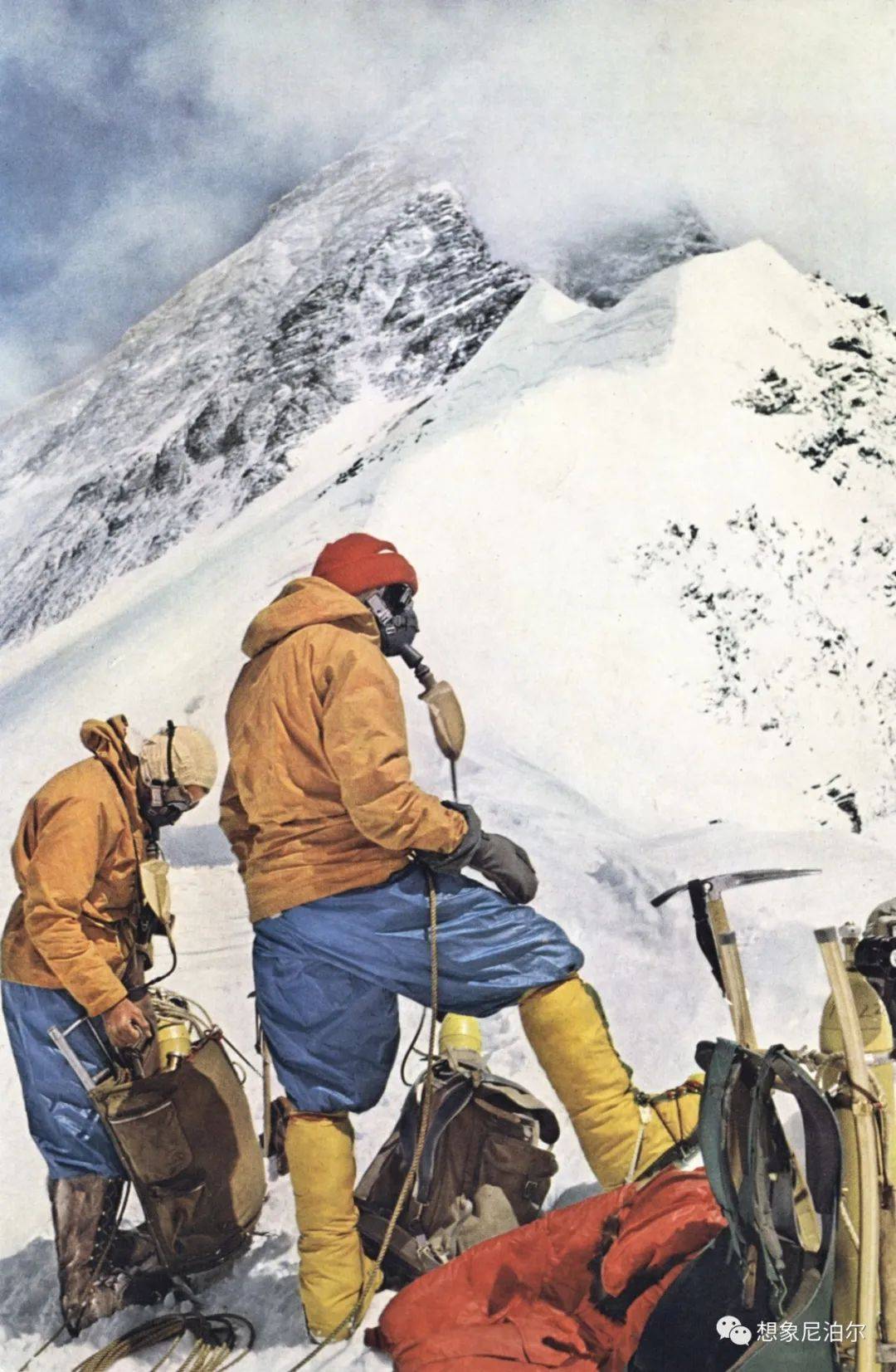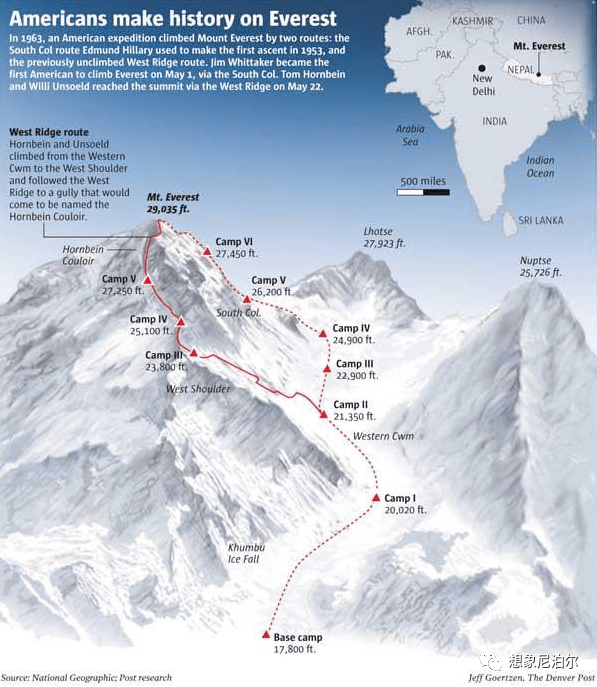 他们带着瓶装氧气开辟了一条全新的、困难的路线,这条路线迄今为止只重复了七次。首先,霍恩拜因和昂索尔德攀登了西山脊,然后在强风中穿越到北壁的上部区域。两人穿过一条后来被命名为“霍恩拜因大雪沟”(Hornbein Couloir)的显著沟壑,向上攀登,又横穿回西山脊,最终于5月22日傍晚站在顶峰。