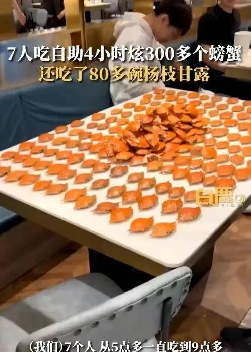 张先生介绍,当时是朋友7个人一块去的,大家的饭量平时都很大,吃得多,所以出来吃饭一般都选择自助餐厅,在这家餐厅吃了4个小时(5点-9点),一共吃了80多碗杨枝甘露、300多个螃蟹、50多盒榴莲、甜虾和生鱼片也吃了不少,小龙虾也一直没停过,最后吃到人家店铺下班。