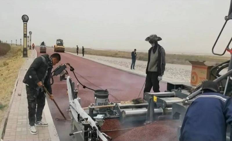 5月6日,内蒙古乌海市海勃湾区北部的黄河岸边,刚铺设完成的红色沥青道路鲜艳明亮,与母亲河相映生辉。工人们热火朝天加速建设,“母亲河之旅”马拉松赛道建设正酣。