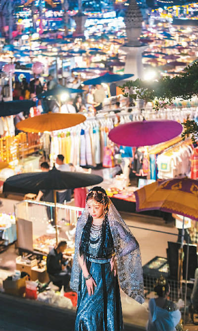一名游客在云南省西双版纳傣族自治州景洪市告庄西双景星光夜市旅拍。 新华社记者 陈欣波摄