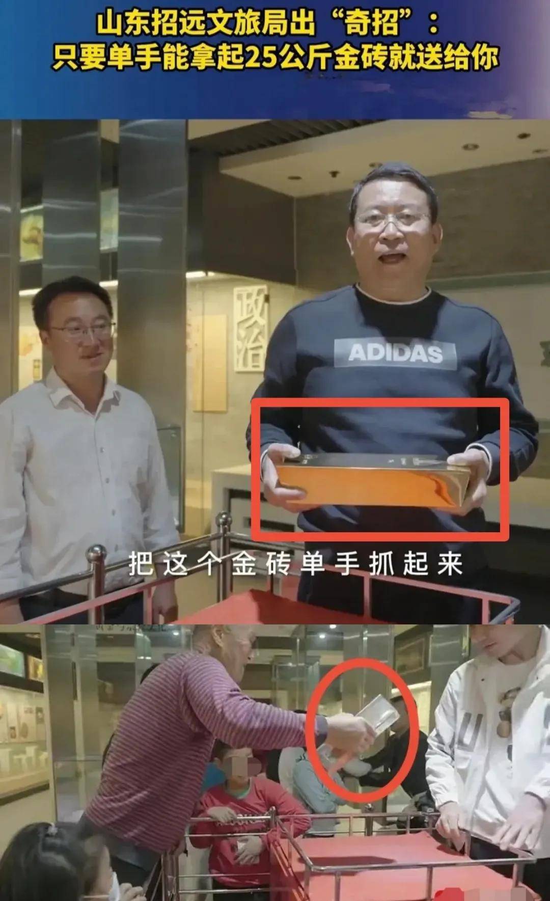 视频画面显示,招远市文化和旅游局局长说:“我手中抱的是纯金的金砖,25公斤,价值一千多万。在这里我郑重承诺,大家如果是按照我们的规则,把金砖单手抓起来,那这个金砖就送给你。”