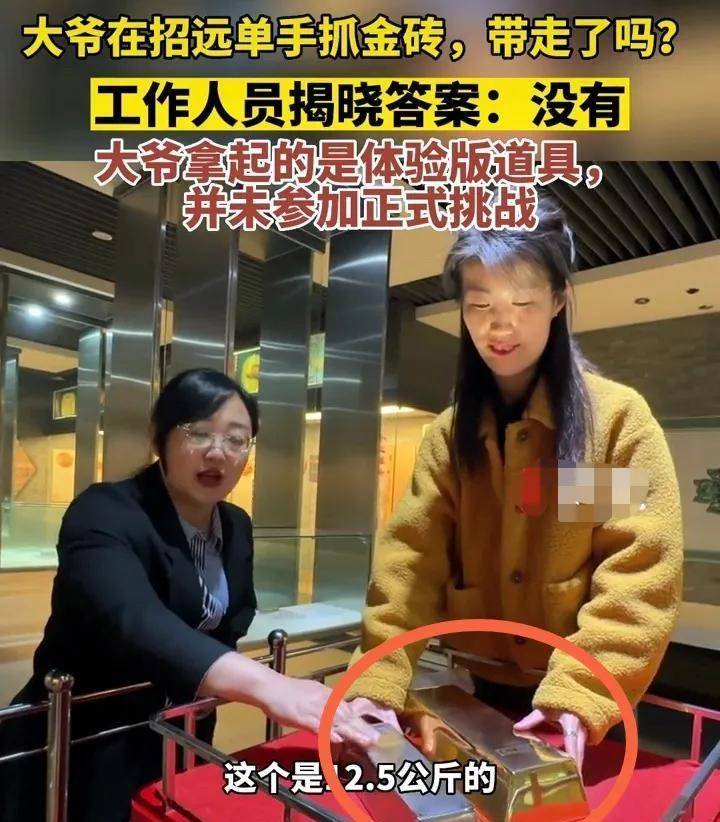 虽然大爷单手拿起了金砖,但活动方表示,那只是一块15公斤的体验版金砖,并不是活动中的25公斤金砖,因此大爷的单手拿金砖不算数。