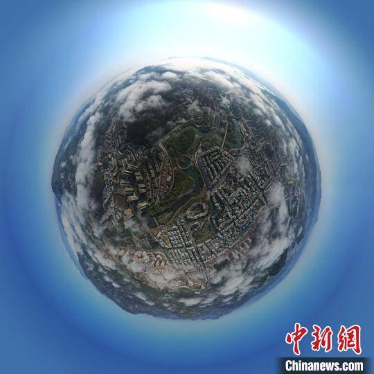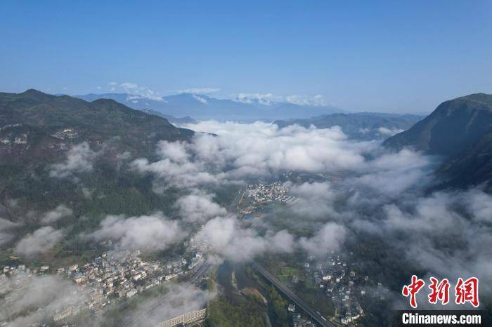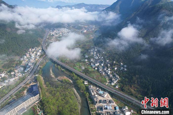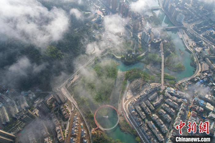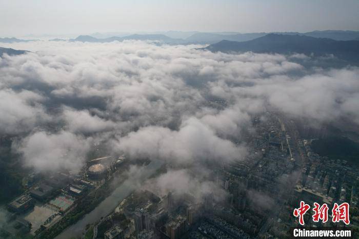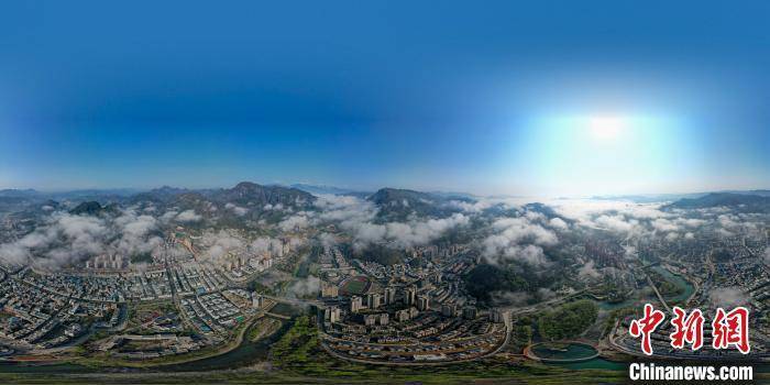 俯瞰江口县县城全貌,云雾缭绕美如画。 李鹤 摄