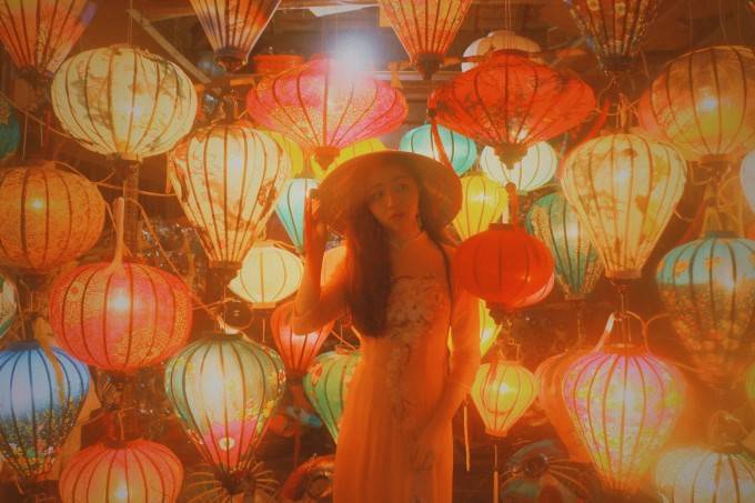 某天,我漫无目的地搜索游记,突然眼前一亮,照片里,是一个身着奥黛的女子,背景是满满色彩的古意灯笼。
