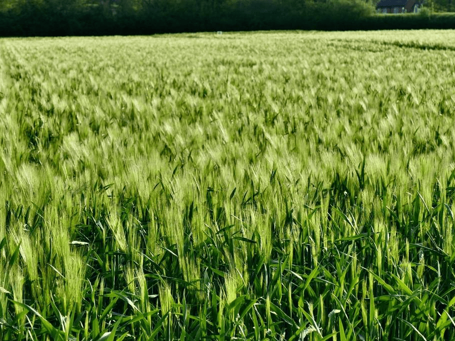 英国牛津郡Dunsden,农民种植的作物在傍晚的阳光下闪闪发光。