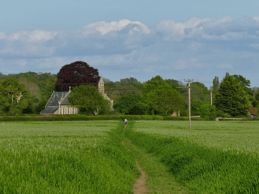 英国牛津郡乡村傍晚时分,庄稼闪闪发光,民众外出休闲。