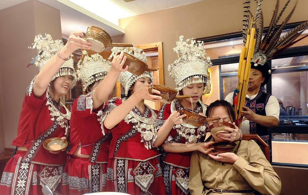 在客人用餐片刻后,四五名头戴漂亮银饰的苗族姑娘手捧着酒碗,随着芦笙的吹奏声,唱着苗家的敬酒歌谣向客人敬酒。苗族姑娘把酒碗倒满,从高到低,依次排开,将精酿的米酒一叠一叠接连倒入客人的酒碗中,似“酒瀑”一般绵延不断,直到客人全部饮完。这就是贵州苗族特色风情的“高山流水”,也代表着贵州人热情好客的酒文化。