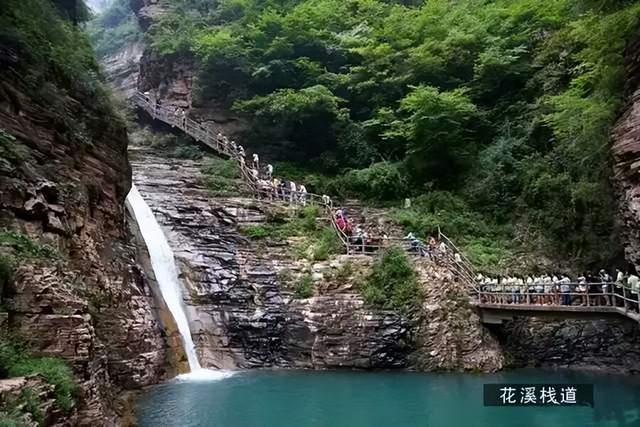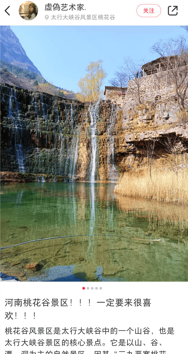 闻水声,如鸣佩环,心乐之。伐竹取道,下见小潭,水尤清冽。全石以为底,近岸,卷石底以出,为坻,为屿,为嵁,为岩。青树翠蔓,蒙络摇缀,参差披拂。潭中鱼可百许头,皆若空游无所依。日光下澈,影布石上,佁然不动;俶尔远逝,往来翕忽。似与游者相乐。潭西南而望,斗折蛇行,明灭可见。其岸势犬牙差互,不可知其源。坐潭上,四面竹树环合,寂寥无人,凄神寒骨,悄怆幽邃.......。不更是描写太行大峡谷中的桃花谷景区吗?出自文学家柳宗元《小 石潭 记》中的句子。