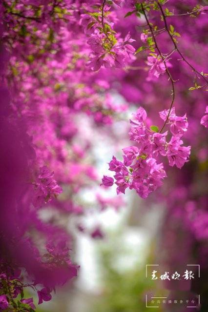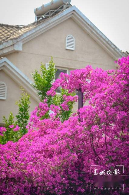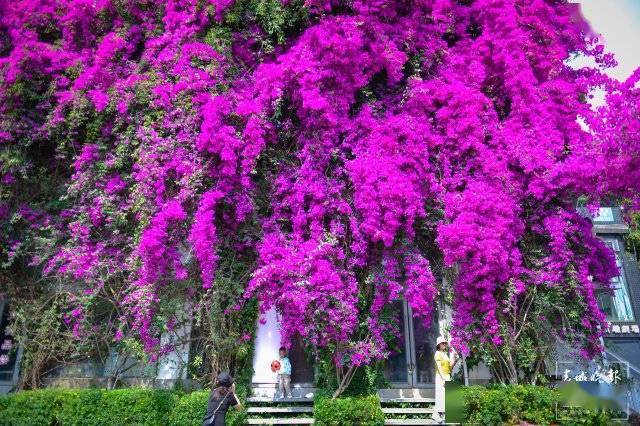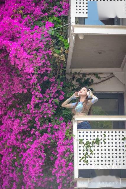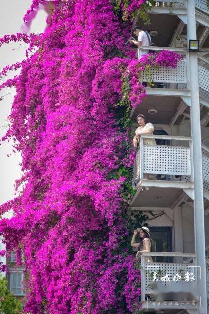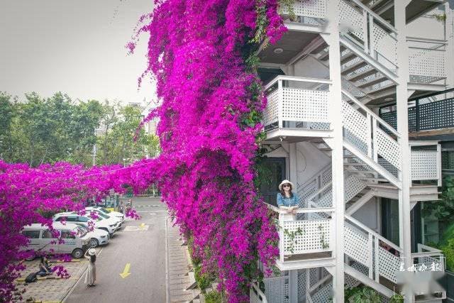 这里的三角梅除了开出一帘高空瀑布,它还沿着一层的围墙开出了一个“花拱桥”,站在一楼拍照就很出片,爬上楼层也很容易以花为背景,随便一件白衬衫、白T恤都能拍出明媚又浪漫的美照。