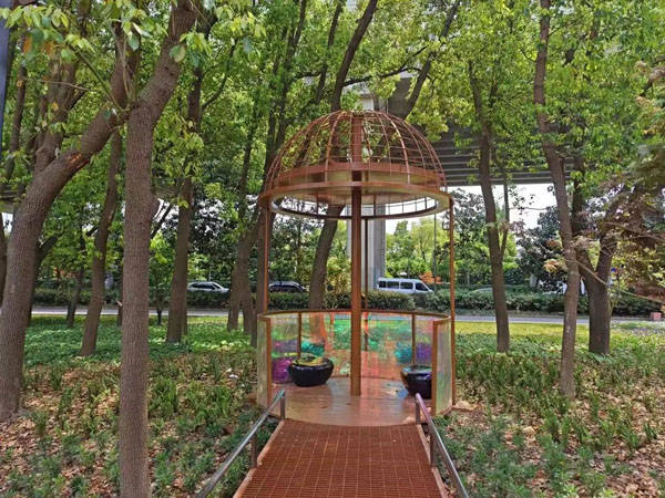而与“鸣翠林”名字相呼应的是入口增设的特色构筑物和休憩空间,比如地面上印有蝴蝶花样、路边建造了可供鸟儿暂时栖息的鸟屋,还有设计成鸟笼的休憩区。