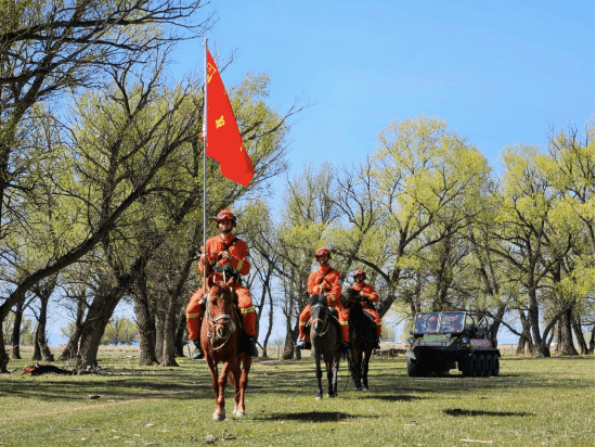 这不是我们第一次驻防,但这是我们距离边境线最近的一次,近的就彷佛出个早操的功夫就能出一趟国,这里不仅离边境近,这里感觉离天空也很近,一朵一朵近在咫尺的云带来的压迫感其他人是感受不到的。这里还有蓝的不可思议的天,有美到窒息的草原,有像画一样出现在草原上的马儿和羊儿,但是,也有像后妈的手打在脸上的风飞沙,它叫莫音塔勒,真是一个让人又爱又恨的地方。而我们就在这里守望森林,预防各种火灾险情,化身保卫这里的橙色“屏障”。其实在很多人的眼里,边疆永远都是那种“春风不度玉门关”的苍茫和辽远,可准确地来说,这里并不是春风不度,而是狂风呼啸。风吹黄沙漫漫,恶劣的气候环境带来的是我们驻防的艰苦,风过尘起,远远望去分不清哪里是天、哪里是地。有时候风甚至吹得我们喘不动气,顶着狂风的巡护也早已经变成了我们工作中的日常。