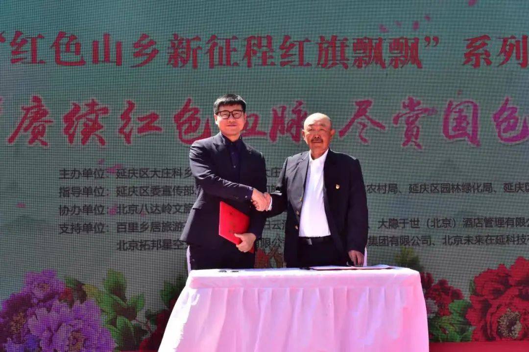 开幕式上,大庄科乡董家沟村与百里乡居旅游开发有限公司进行签约,联合企业与乡村共同发展,加强民宿合作。同时,大庄科乡相关业态代表现场进行推介,从吃、住、游、购、娱等角度推介了2023年红色旅游线路,并通过“长城内外”公众号发布“一码玩转大庄科”,以数字赋能的方式,助力全域智慧旅游协同发展。
