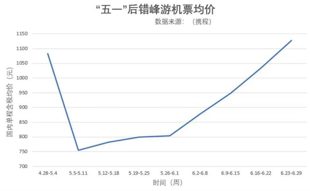 根据携程数据,“五一“假期前后(4.28-5.4)国内机票单程含税均价为1082元,而假期后两周(5.5-5.18)机票均价则降低至760元,降幅达到三成左右。