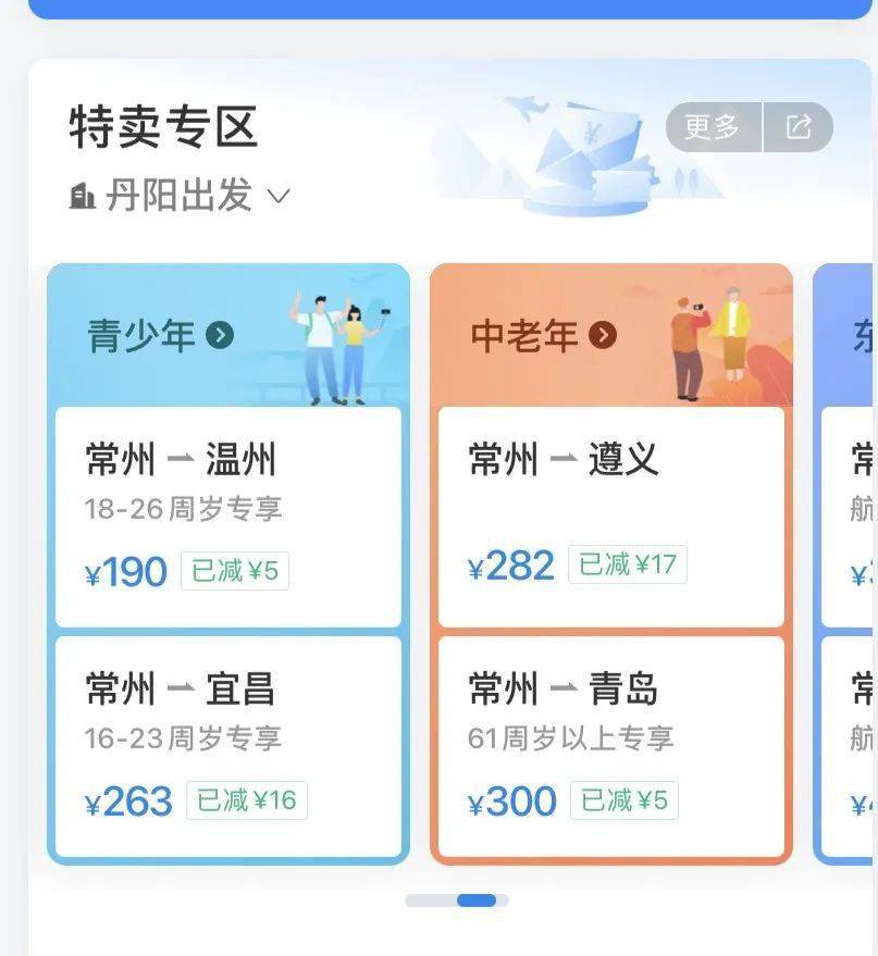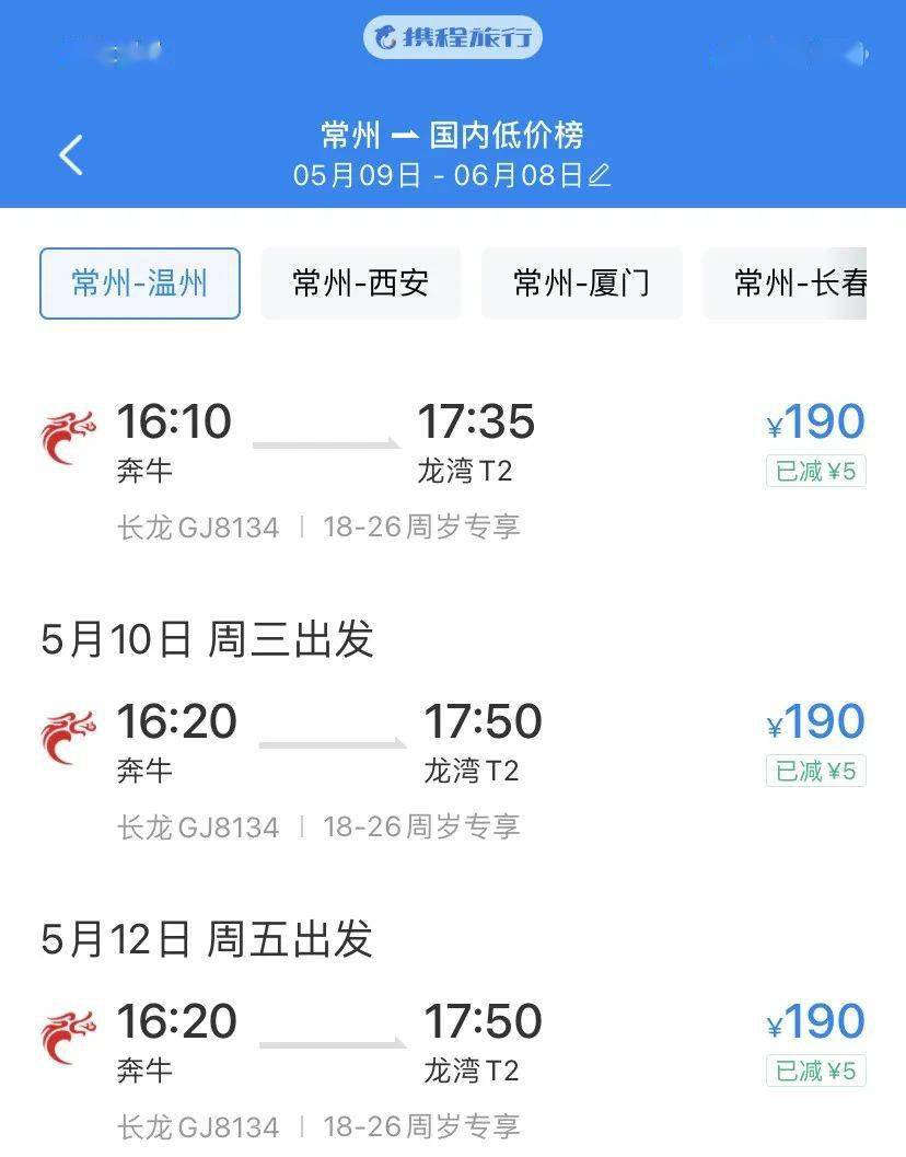 帮帮在携程平台看到,常州飞往 温州、宜昌、青岛、遵义等多条航线的机票价格下降明显, 200元左右便可直飞出游(年龄有部分限制)。