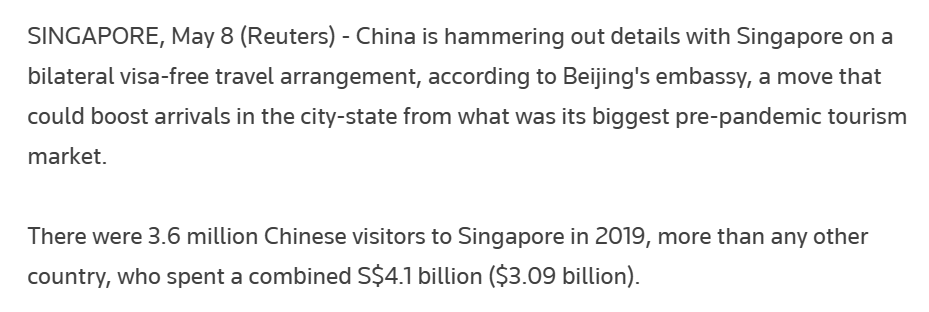 先看签证方面的消息,昨天路透社的一则新闻:称中国和新加坡正在敲定互免签证的细节。