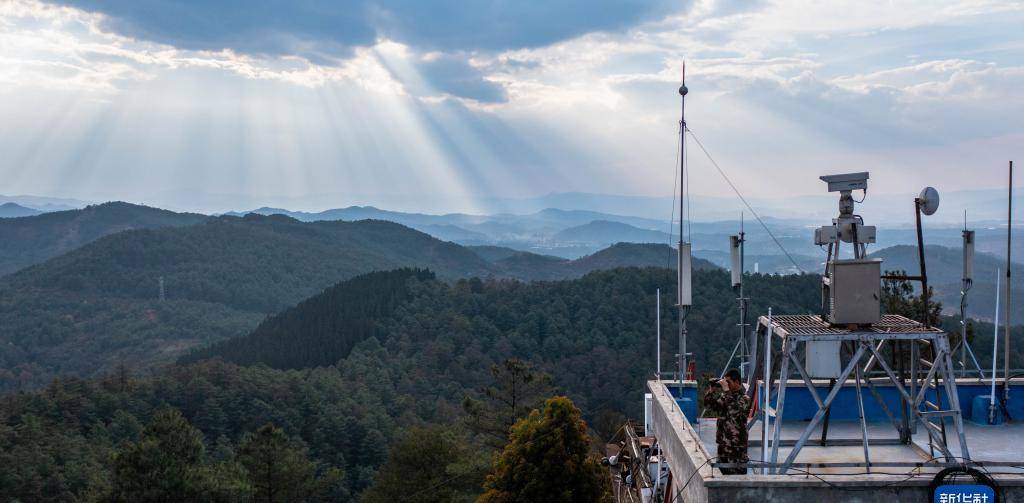 护林员陈华在昆明海口林场瞭望台瞭望(3月20日摄,无人机照片)。