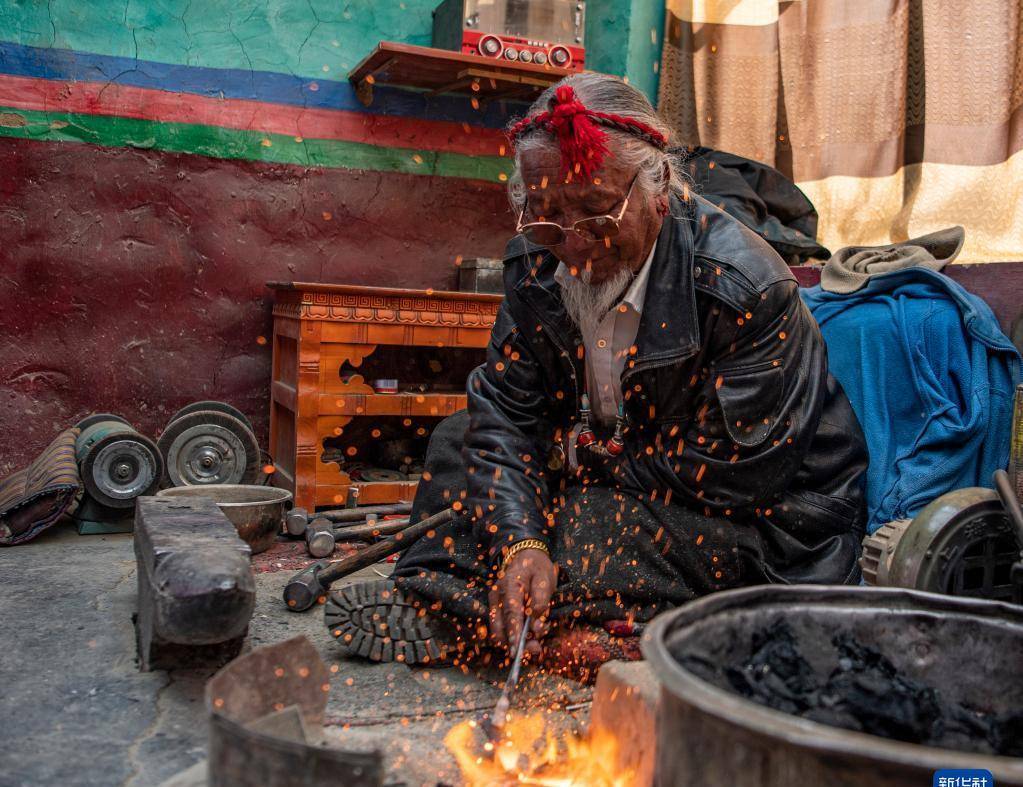 拉孜孜龙藏刀锻制技艺第六代传人次旦旺加在制作藏刀(3月10日摄)。