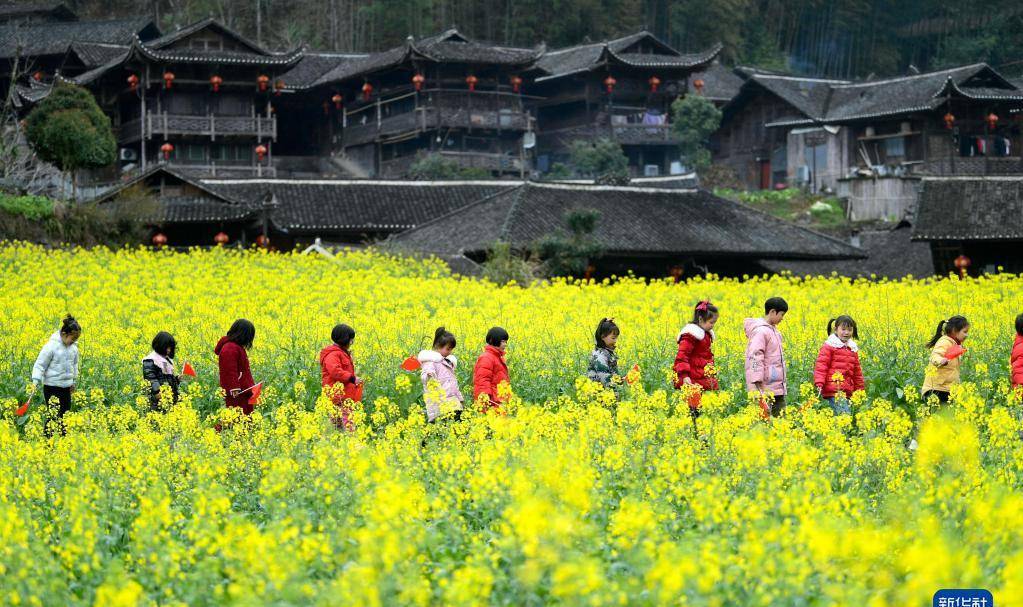 3月18日,孩子们在湖北省宣恩县彭家寨古吊脚楼前的油菜花田里行走。