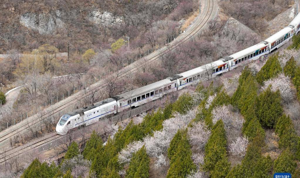 3月23日,一列S2线列车行驶在北京居庸关长城脚下花海中。