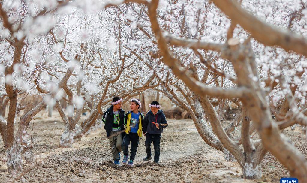 3月18日,小朋友在“新疆第一春·花开吐鲁番”2023吐鲁番杏花节现场游玩。