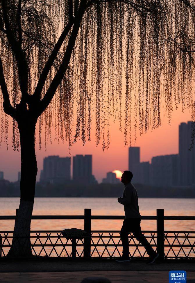 3月14日,在山东省临沂市兰山区,市民在沂河岸边柳树下晨跑健身。