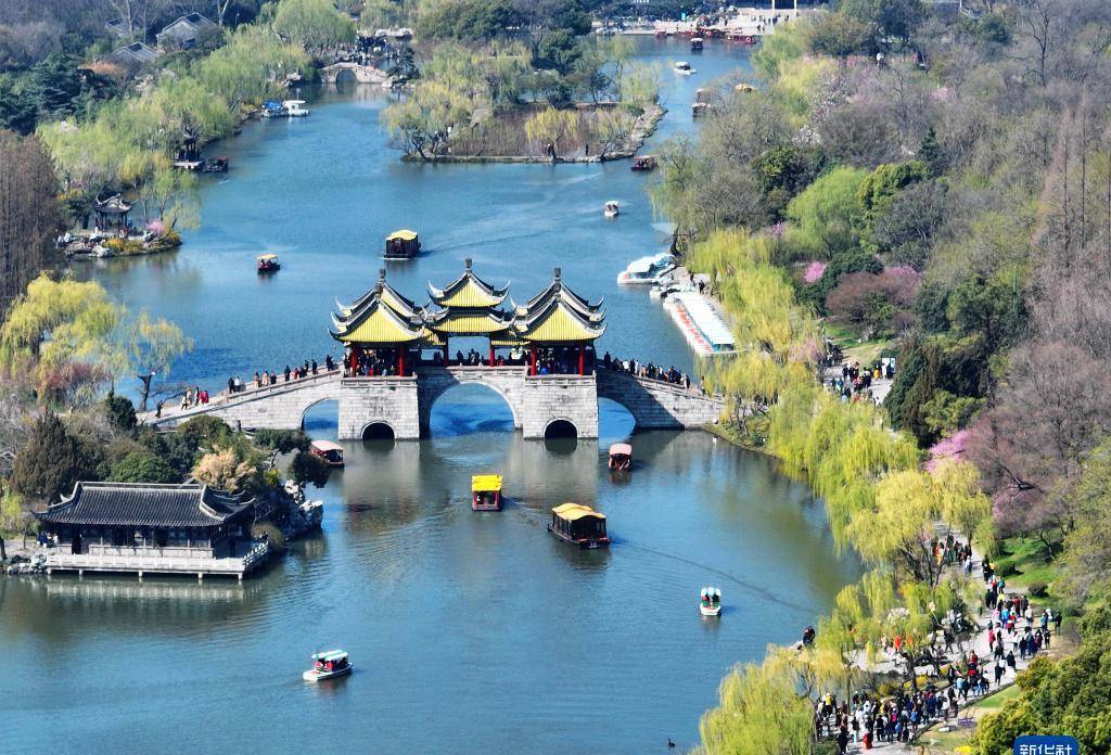 3月13日,游客在花红柳绿的江苏扬州瘦西湖风景区游玩(无人机照片)。