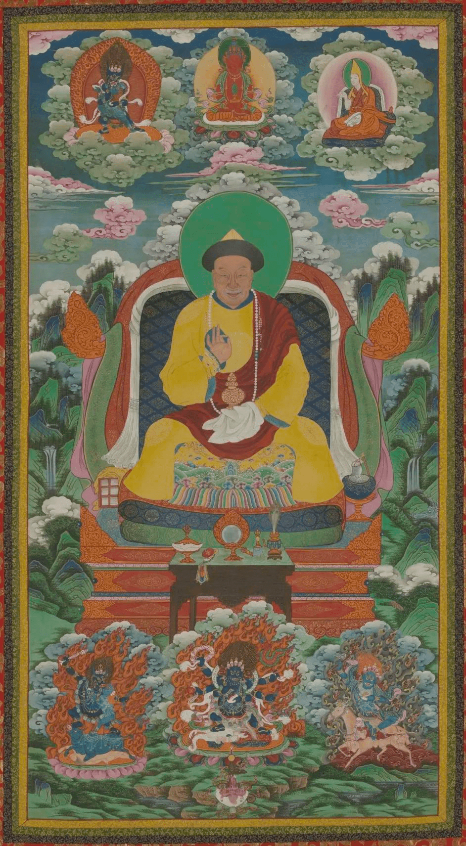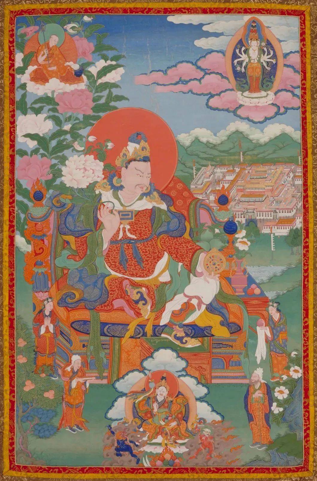 松赞干布(617-650)是吐蕃王朝的创建者,在位期间,统一西藏,创制吐蕃文字,与唐朝联姻。画中松赞干布以轮王坐姿坐于装饰华丽的宝座之上,左手持法轮,右手持白莲。宝座两旁,分别立有唐朝的文成公主和尼泊尔的尺尊公主,稍前侧手持经书者为藏文的创制者吞米桑布扎,蓄须持杖者被认为是吐蕃大臣禄东赞。在西藏传统中,松赞干布被认为是观音菩萨的化身。