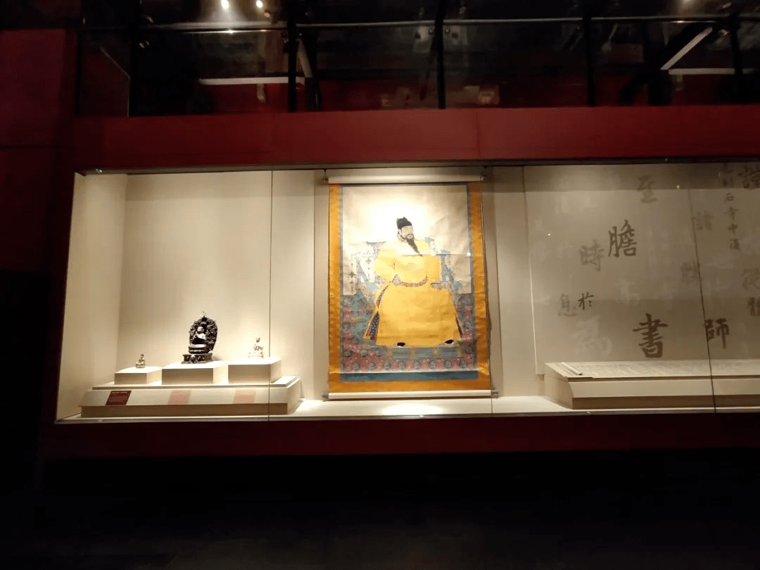 展品永乐帝画像唐卡来自布达拉宫。明成祖朱棣(1360-1424),身穿黄色龙袍端坐在龙椅宝座上,头戴翼善冠,龙袍盘领窄袖,前后及两肩各金织盘龙,腰束镶玉銙带。