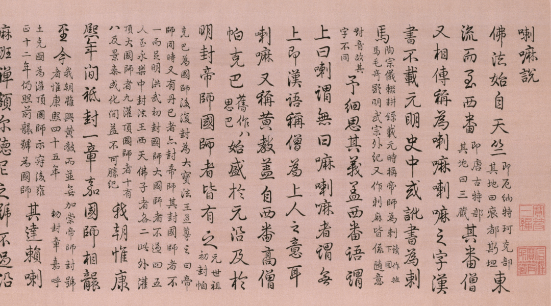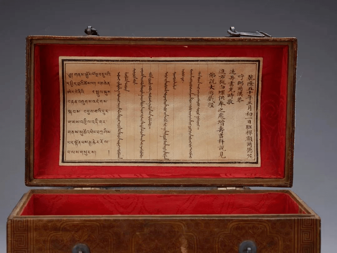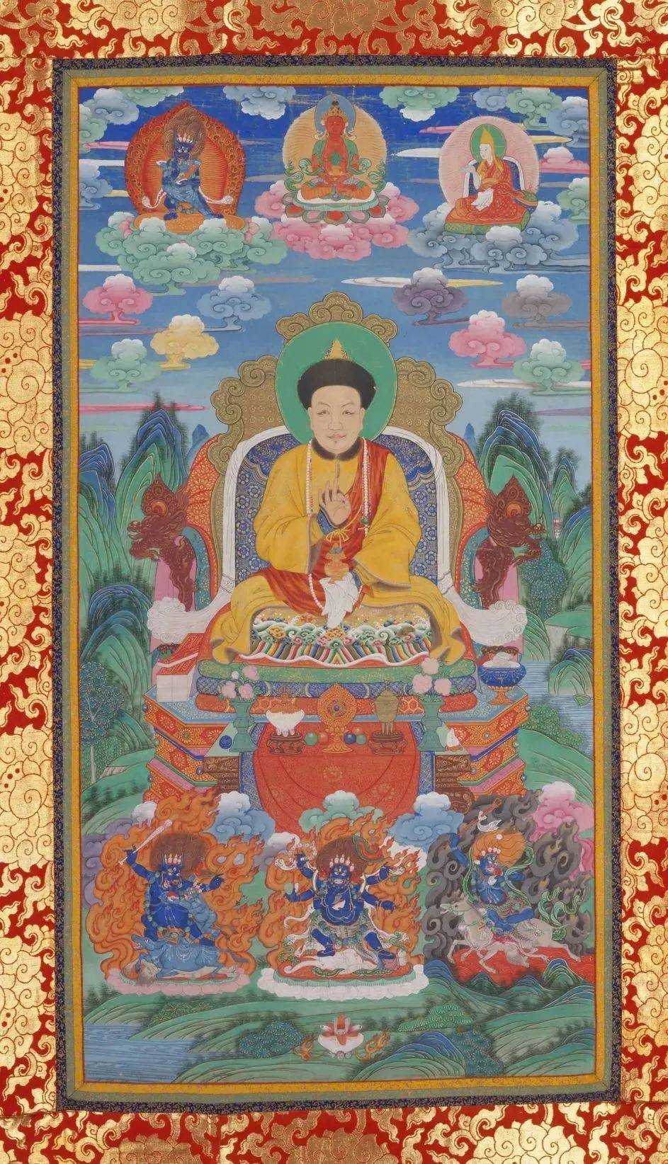 《乾隆帝佛装像》描绘了乾隆帝佛装时样式,头戴黄班智达帽,右手说法印,左手持轮,肩上装饰宝剑和经书,以示是文殊菩萨的化身。“夫定其事之是非者,必习其事,而又明其理,然后可”,乾隆身体力行,习藏语,读经书,接受三世章嘉国师的灌顶,深晓兴黄教安众蒙古的重要性,御制《喇嘛说》一文,确立“金瓶掣签”制度,推行至今,影响深远。