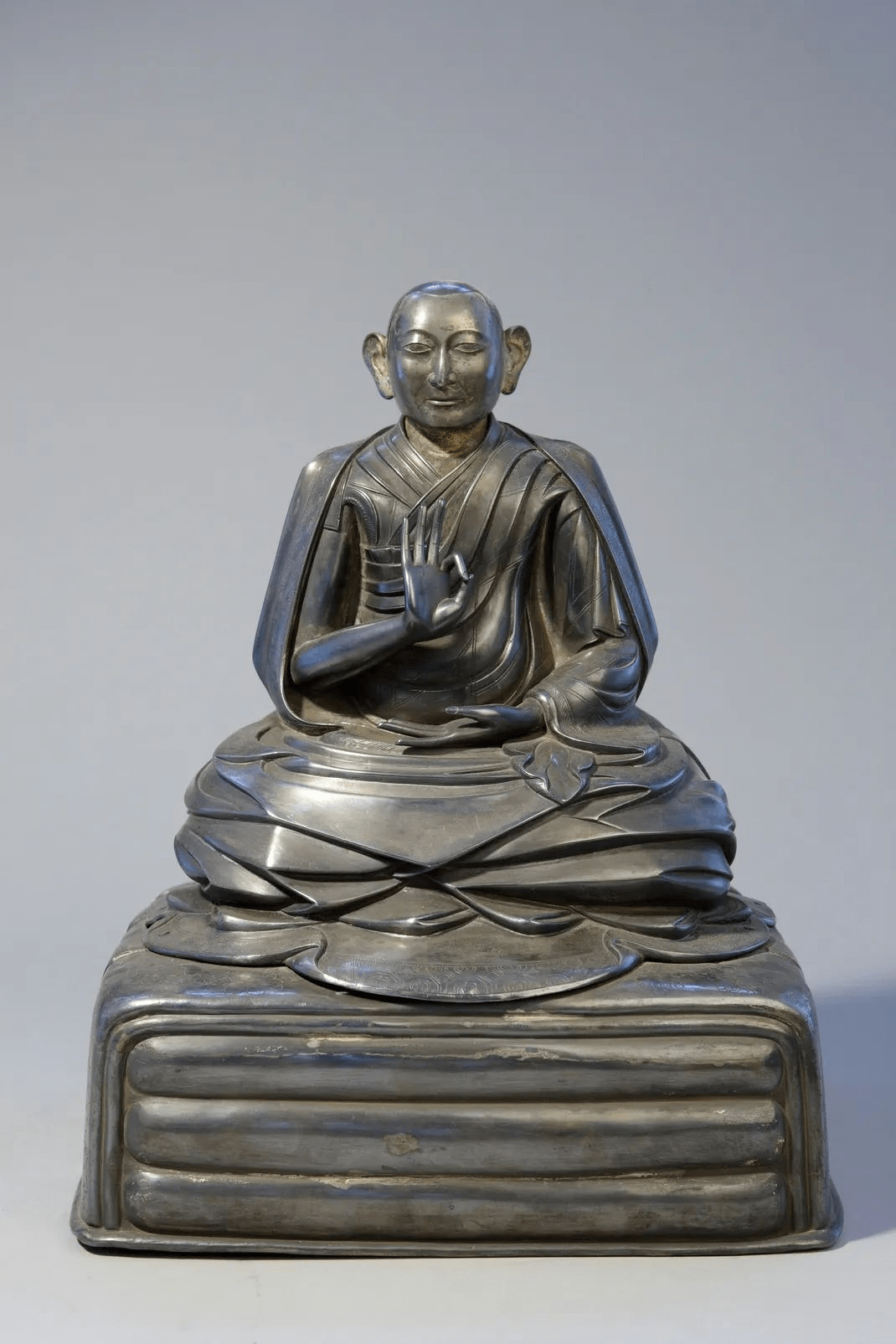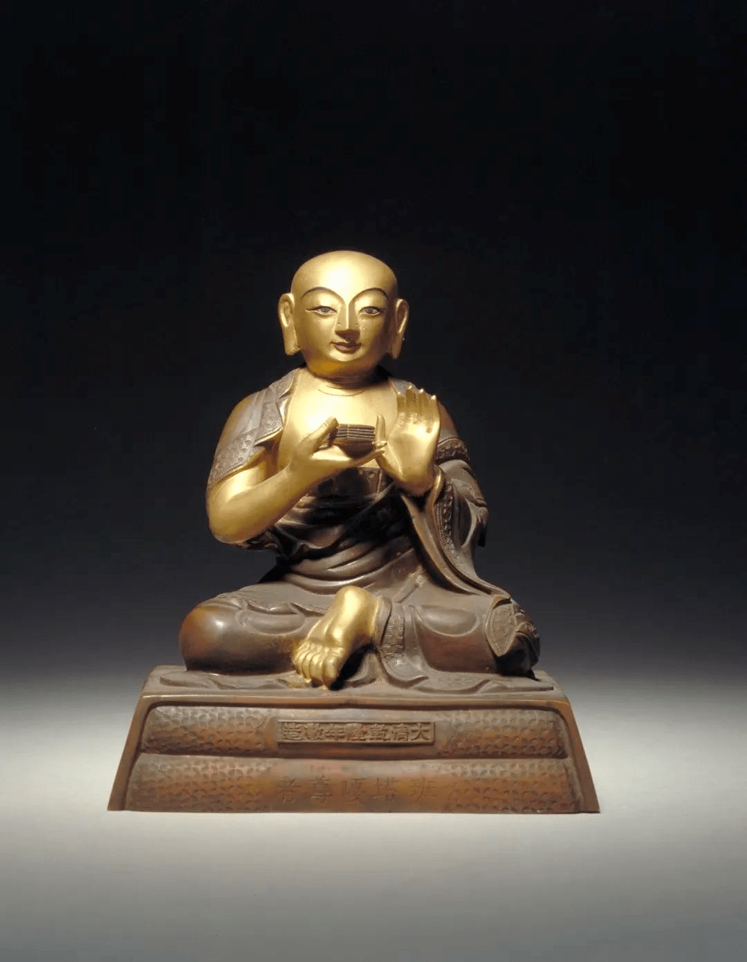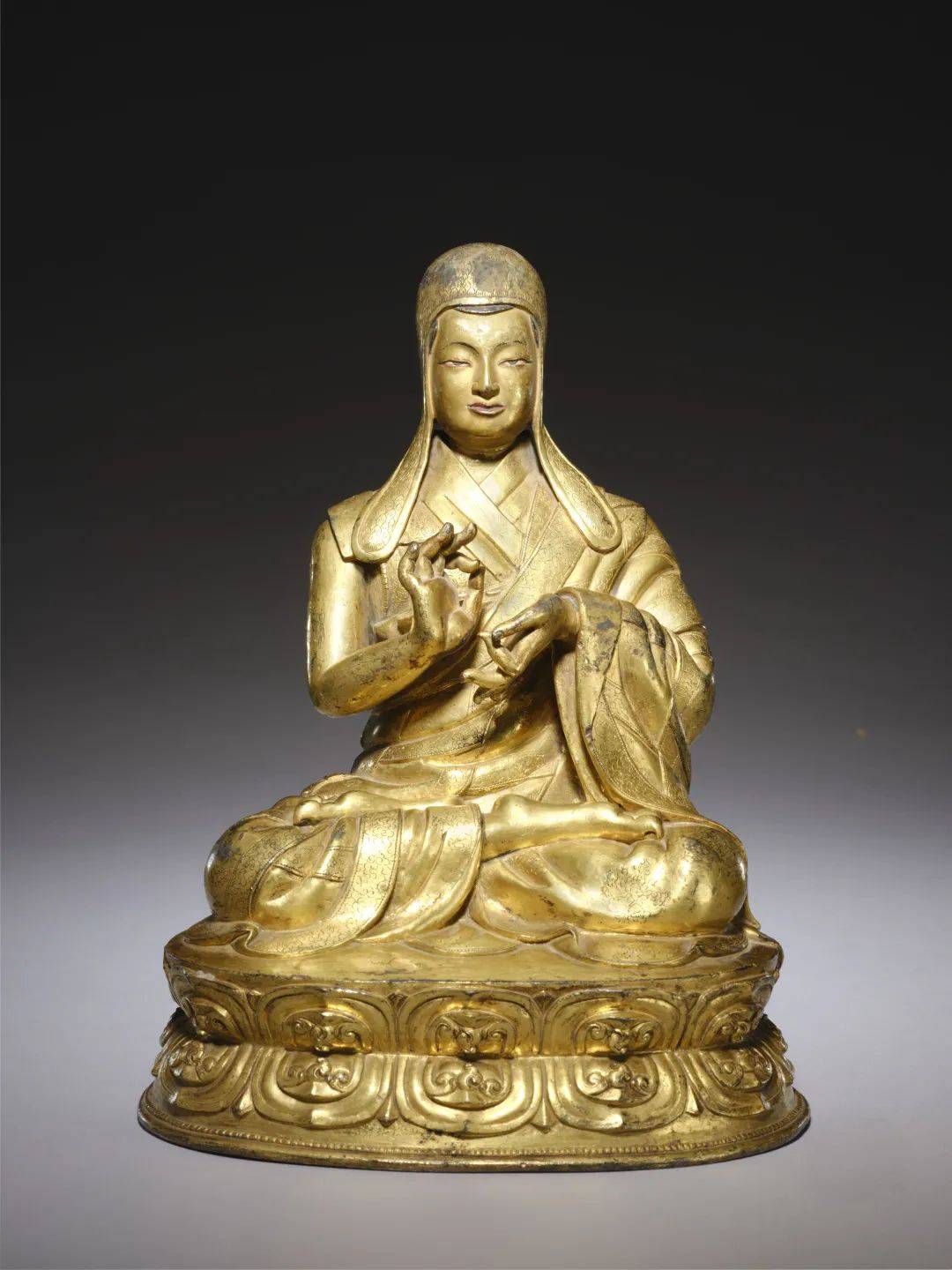 西藏博物馆的铜镀金八思巴像 ,头戴萨迦派圆顶僧帽,双手说法印,跏趺坐。八思巴(1235-1280)全名八思巴罗追坚参,是藏传佛教萨迦派第五代祖师。南宋宝祐元年谒见蒙古亲王忽必烈,忽必烈即位后被尊为国师,统领全国佛教事务,同时也是管理西藏地方行政事务的官员。八思巴是蒙古新字的创制者,也是组织翻译汉梵典籍为藏文的学者,为国家统一作出了巨大贡献。元朝萨迦派最受尊崇,封敕萨迦派帝师就有14位,这些高僧长期驻锡北京,兼帝师与西藏最高首领的双重角色,八思巴便是最著名且地位最高的一位。