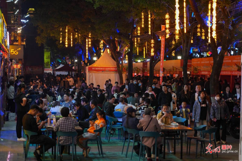 2023年4月28日,陕西咸阳,北平街夜市上品尝美食的市民。北平街夜市,是该地夜经济特色街区之一,拥有150余家商铺近100个摊位,汇聚了各式陕西以及全国各地特色小吃。(赵冰摄/光明图片)