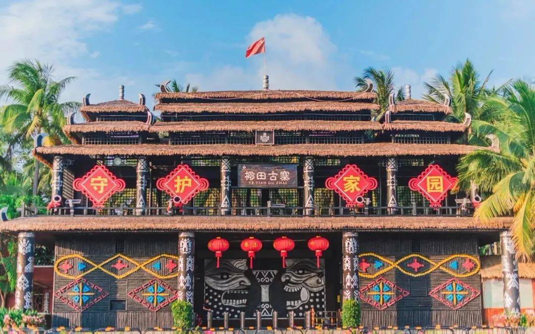 陵水县英州镇英州村椰田古寨景区。景区内的建筑既有黎族的金字屋、船形屋和寮房,又有苗族的吊脚楼。在这里也可以近距离地感受苗蛊文化,尝一尝风味独特的黎苗族美食。