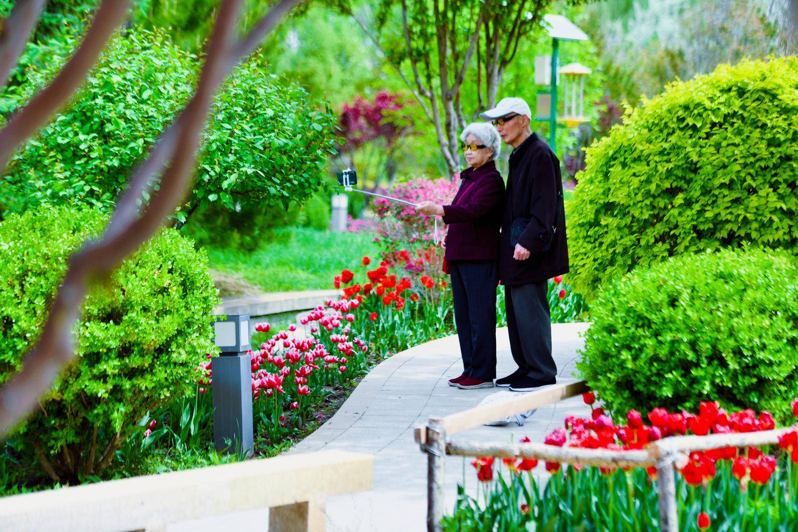5月8日,银川花博园内,绿树成荫,百花盛开,一对暮年夫妇在幽静的林间小道拍照留念。五月的湖城银川处处散发着初夏的迷人气息,百花齐放,万物生长。眼下银川花博园的各色鲜花迎来了盛花期,不少市民来此开启游园赏花之旅。(宁夏日报记者 马楠 王洋 文/图/视频 )