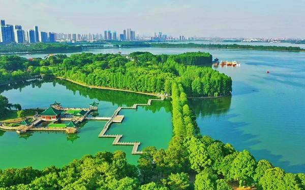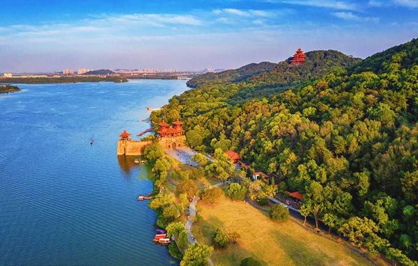 上图:武汉东湖风景区最早开发建成开放的景区听涛景区是一颗绿色明珠,使周边高楼居民临窗而坐就能欣赏到东湖的湖光山色美景。