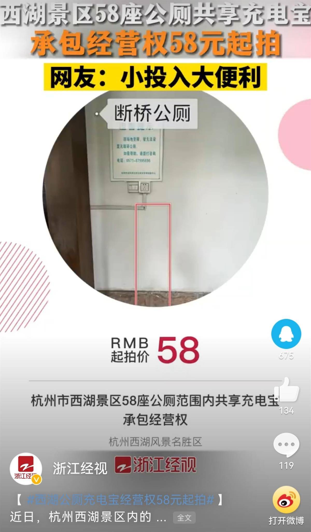 原标题:杭州西湖景区公厕充电宝经营权58元起拍,游客:这个可以有,完美服务