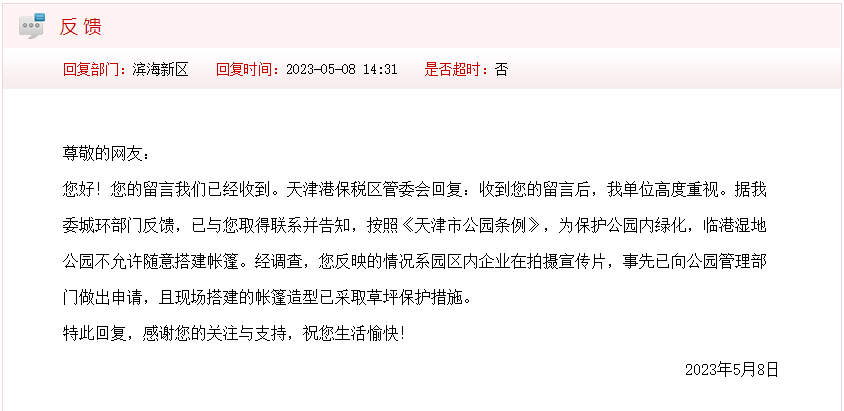 您好!您的留言我们已经收到。天津港保税区管委会回复:收到您的留言后,我单位高度重视。据我委城环部门反馈,已与您取得联系并告知,按照《天津市公园条例》,为保护公园内绿化,临港湿地公园不允许随意搭建帐篷。经调查,您反映的情况系园区内企业在拍摄宣传片,事先已向公园管理部门做出申请,且现场搭建的帐篷造型已采取草坪保护措施。