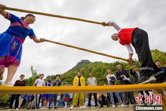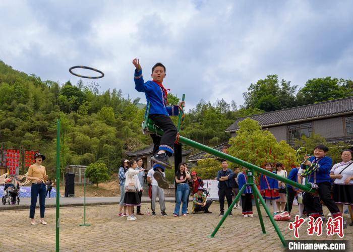 宁国市云梯畲族风情园里的特色活动引来外地游客纷纷驻足观看,与村民们互动。 李晓红 摄
