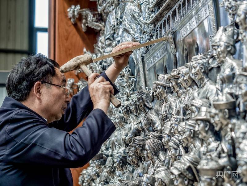 国家级非遗项目鹤庆银器锻制技艺代表性传承人、中国工艺美术大师寸发标正在创作大型银雕屏风(央广网发 李国伟 摄)