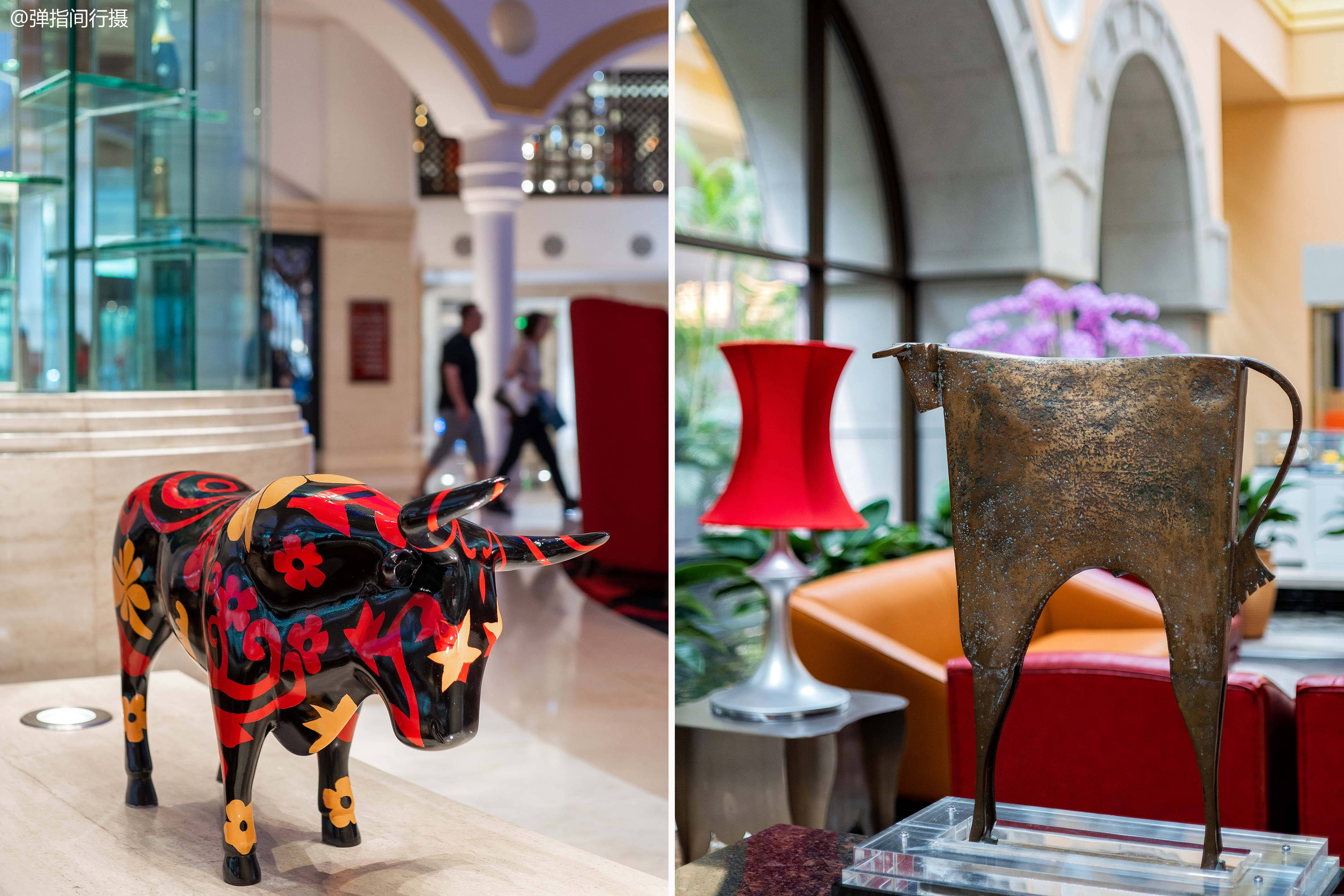 步入酒店大堂,浓浓的西班牙风情扑面而来,正门牛头扶手、铁艺雕花、瓷牛艺术装置及高迪笔下的马赛克元素等极具代表性的西班牙符号,遍布于以黑红与黑黄为主调的空间之中,让人霎时间仿佛穿越到斗牛士的故乡。