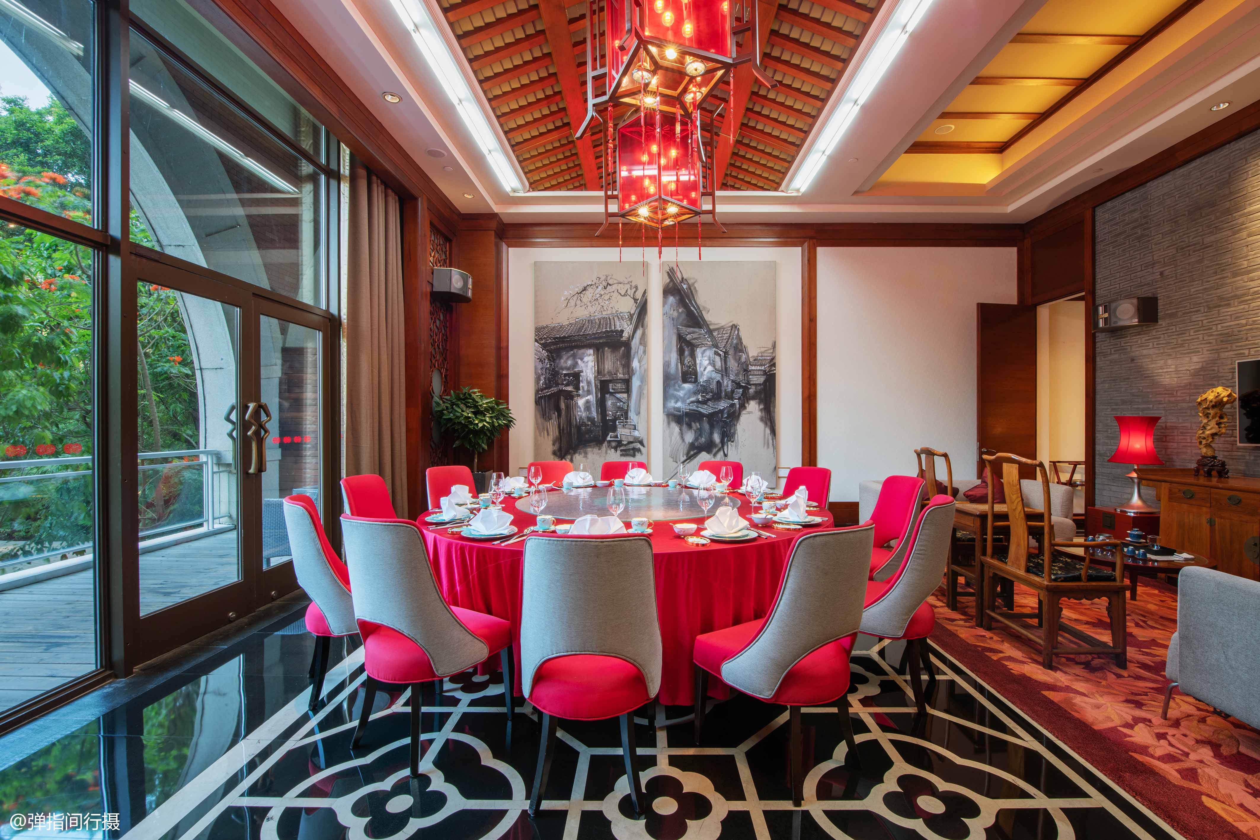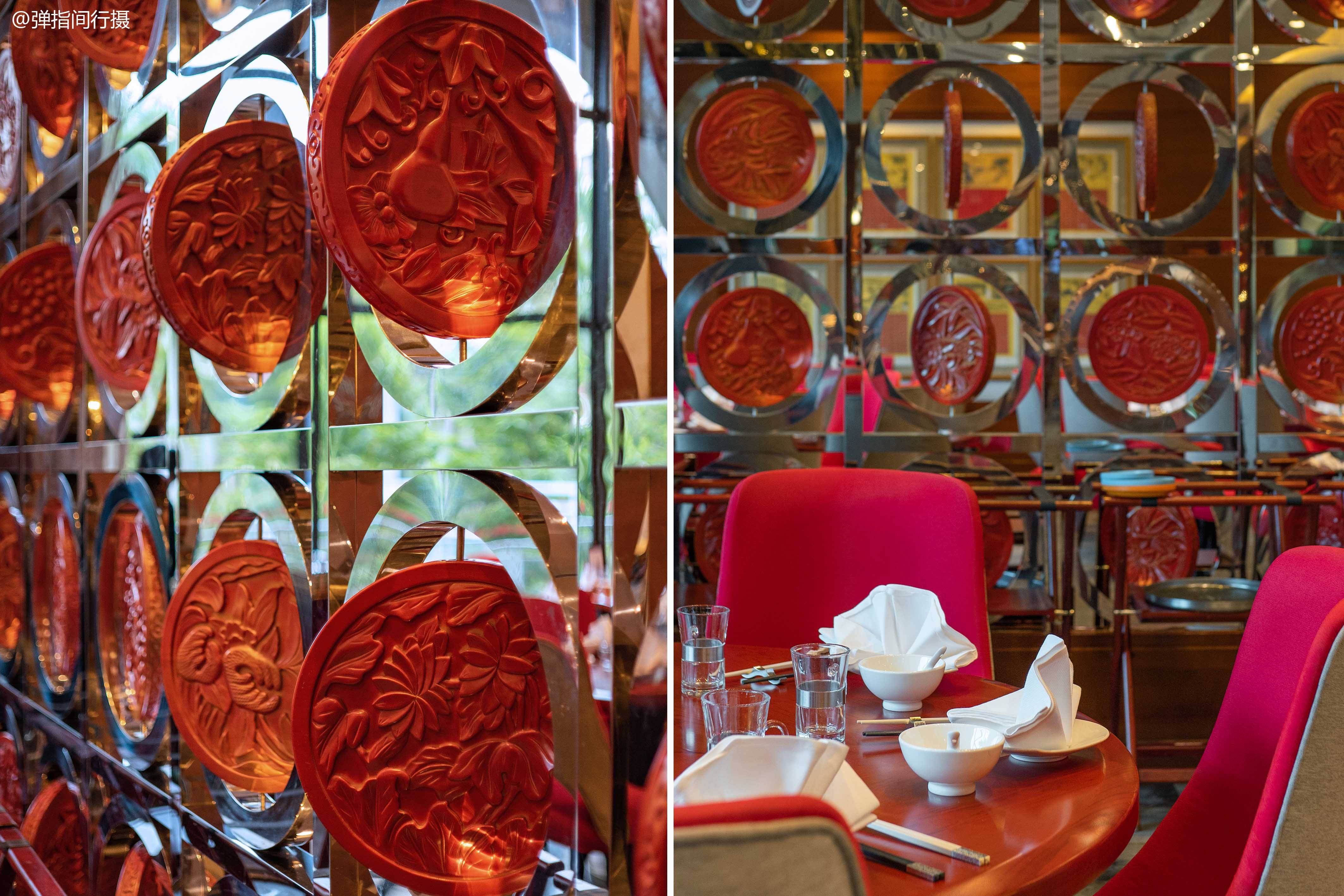 华膳中餐厅设计高贵典雅,格调温馨喜庆,采用红色与黑色为主调,古色古香的雕漆屏风和餐厅员工制服配色相互呼应,与酒店整体西班牙风情色调有异曲同工之妙。