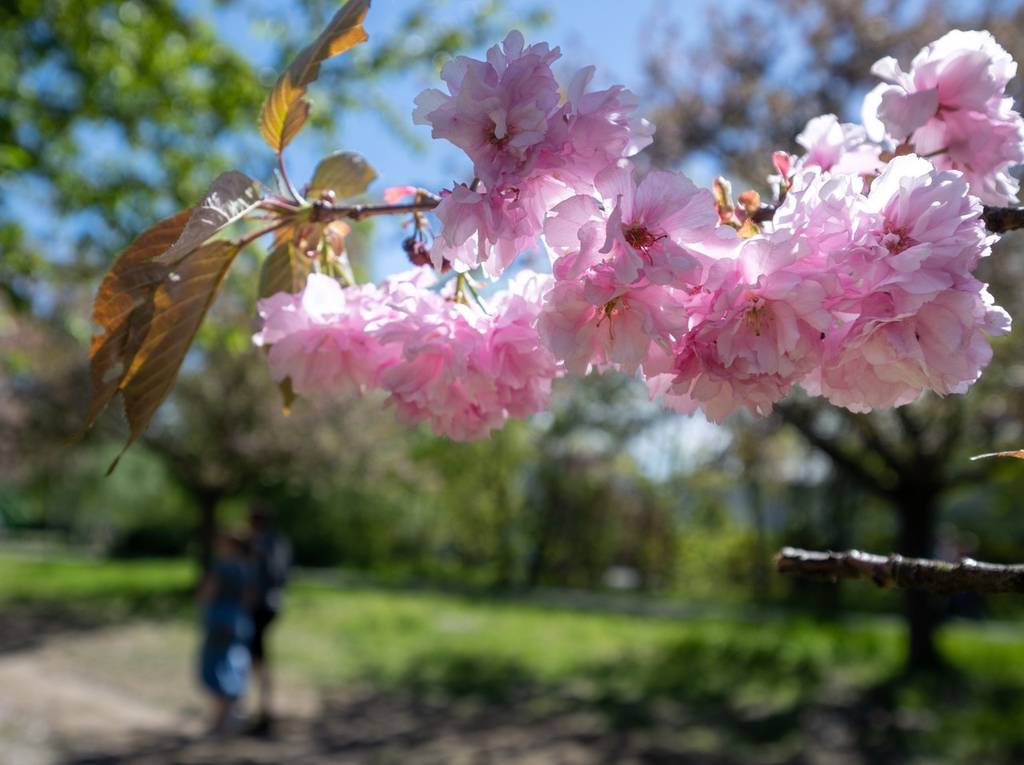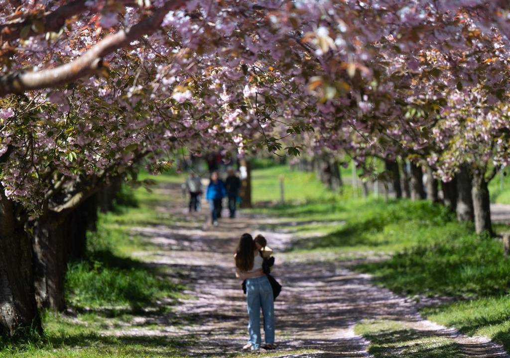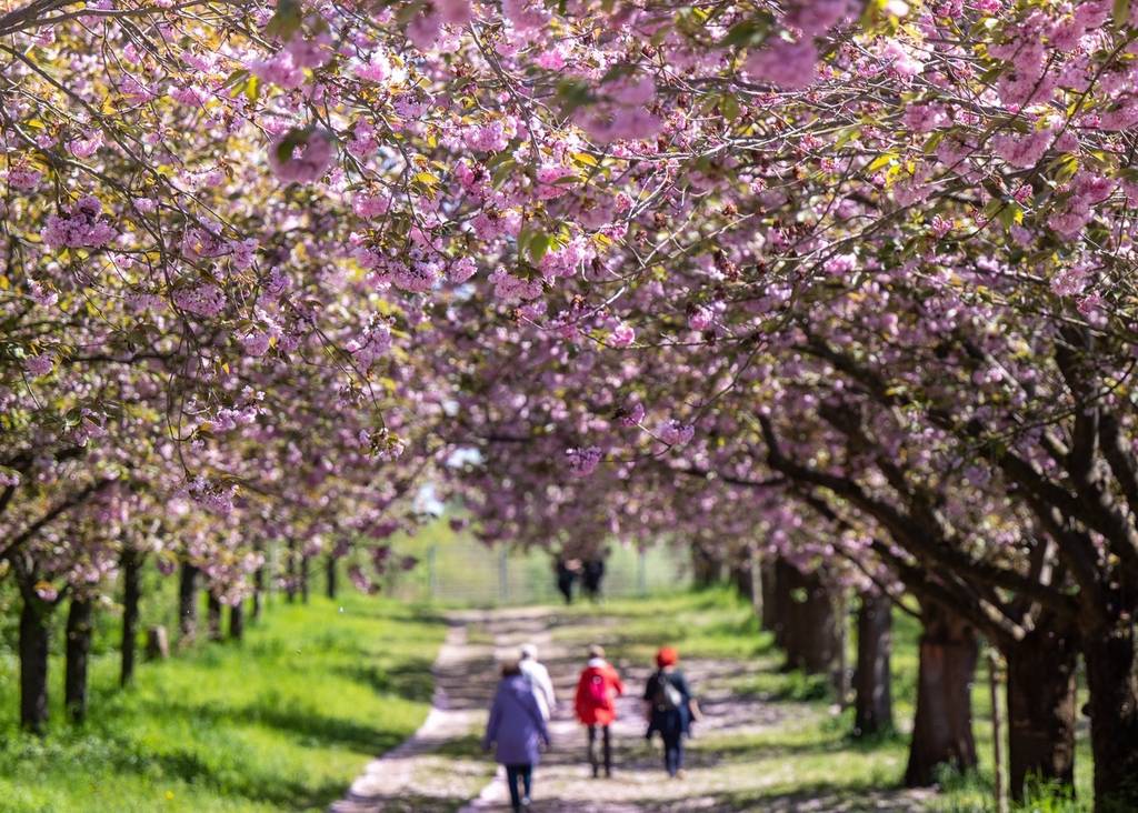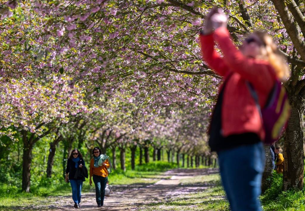 德国勃兰登堡阳光明媚,民众樱花树下悠闲漫步。