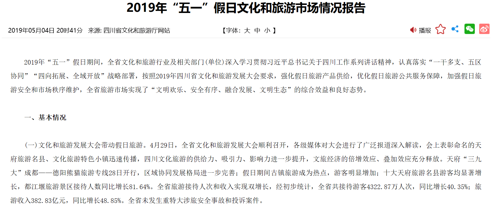 2019年五一,四川全省接待游客4322.87万人次,旅游收入382.83亿元;