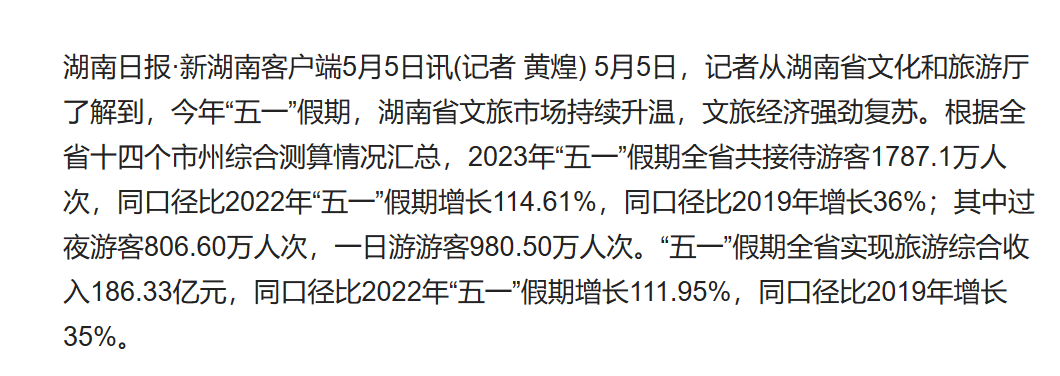 简单总结就是,四川2023年五一期间的旅游人数和收入全面不如2019年同期,人数少了300来万人次,收入接近同期腰斩;湖南2023年五一期间的旅游人数少了但收入多了,人数比2019年少了500来万人次,收入却多了20多亿元;