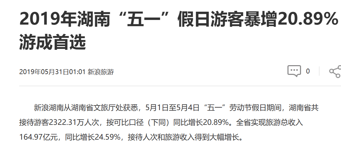 2019年五一,湖南全省接待游客2322.31万人,旅游收入164.97亿元;